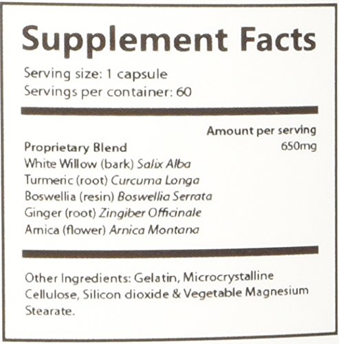 All Natural Joint Supplement Supporting Healthy Joint Pain Relief: This natural joint supplement formula contains five well-recognized herbs that have been used for centuries to support natural pain relief: Boswellia, Willow Bark, Tumeric, Ginger Root and Arnica. One capsule contains 650mg. 100% Herbal Joint Pain Supplement supports healthy joints and joint pain relief.