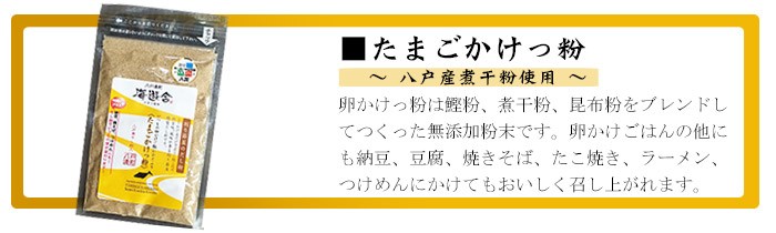 定形外郵便発送の為、お支払い方法が代金引換の場合は送料540円が追加となります。八戸産煮干の風味が香る、八戸削り節屋特製 天然だし粉です。たまごかけっ粉は国産の鰹粉、いわし粉、昆布粉を絶妙にブレンドした無添加粉末です。たまごかけご飯にふりかけたり、納豆・焼そば・ラーメン・冷奴などアレンジで幅広く美味しくご利用頂けます。