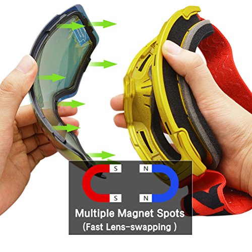 -. Feature : High performance anti-fog and UV400 protection - The X4 ski goggles featured with double lens made of solid PC material which came with unique lagopus anti-fogging treatment and 100% UV400 protection that cuts the glare. / Magnet lens-swapping technology - 8 spots magnet hold the lens tight and easy to replace for replacement and cleaning, 17 different lenses available. Perfect goggles to make your own combination. / Spherical ultra-wide view and smooth venting - More than 180 degree view from this panoramic lens design which provides super clear vision and less visual interference. Two-way ventilation system enhance air-flow and reduce the fogging in warm, moist condition. / Thickened foam padding and more safety - Multiple layer high density foam keeps your face warm and solid anti-wind. Strong PC lens with impact-resistance and durable frame ensure the face and eyes can be well-protected when incidents occurred. / Extra-long flexible strap - For better helmet compatibility, X4 ski goggles use a longer head strap for skier and snowboard who need to wear helmet and facemask, the adjustable strap fit different head size and helmet on the marketplace.