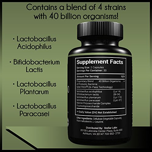 HIGH QUALITY AND HIGH POTENCY: The Stellar Labs® Probiotic 40 is a blend of 4 strains (40 billion organisms) of probiotic bacteria designed to provide a high potency and balance of beneficial bacteria in your gut so that your body can fight off any bad bacteria that can cause loose stool or upset stomach.