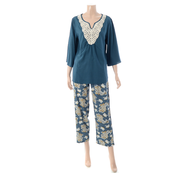 상의 레이스에 꽃나염프린트가 포인트이며 여성스러움이 있어 착용감이 편안한상품입니다