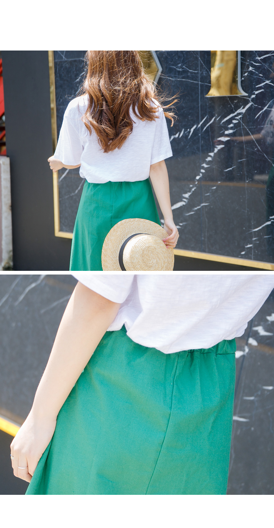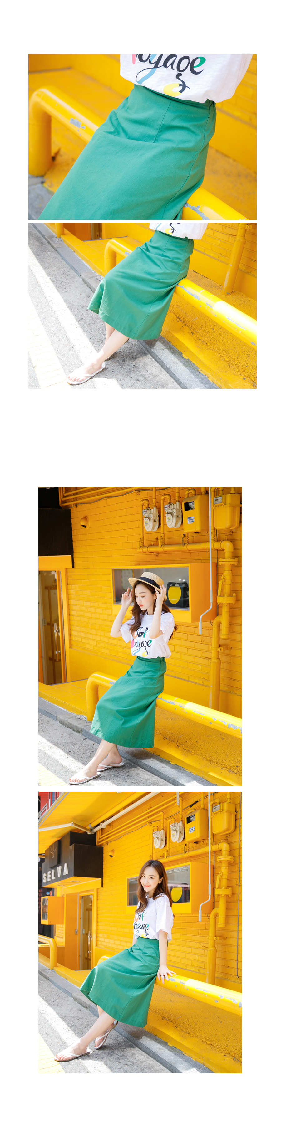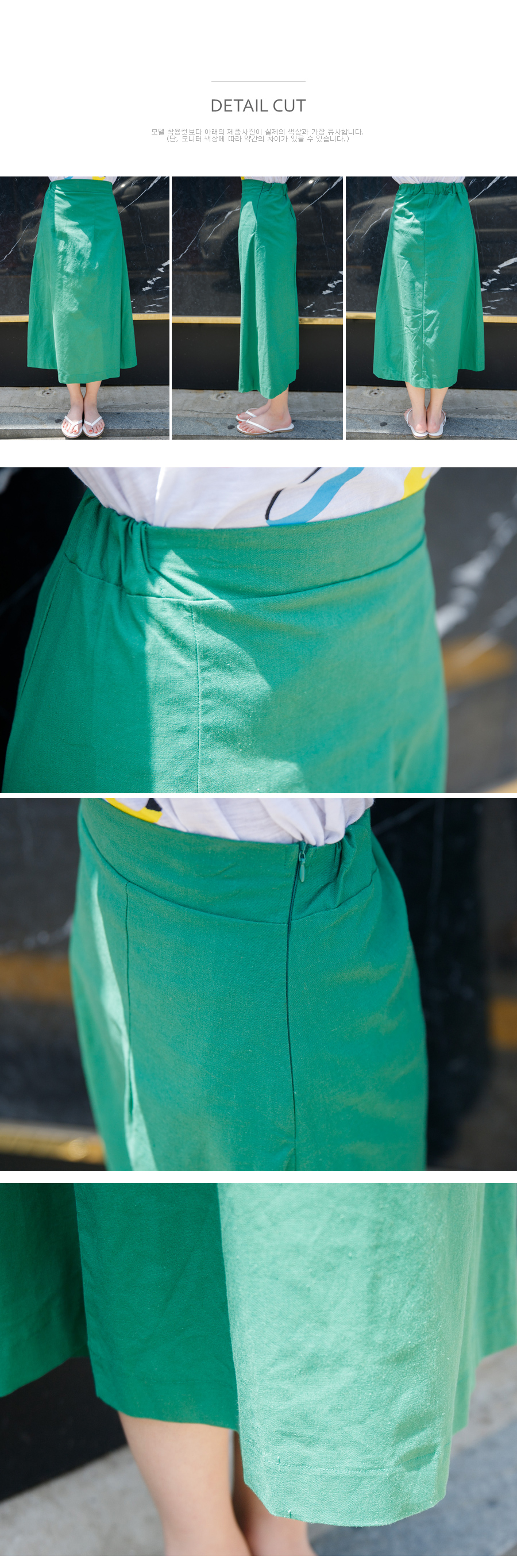 허리 오비단 아래로 세로 절개해주어 리에서 힙으로 내려오는 라인 슬림하고 예쁘게 잘 빠졌어요^^ 160cm 기준으로 7부정도 내려오는 미디 기장입니다