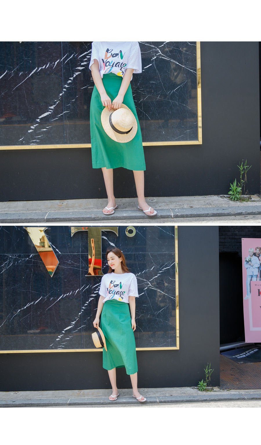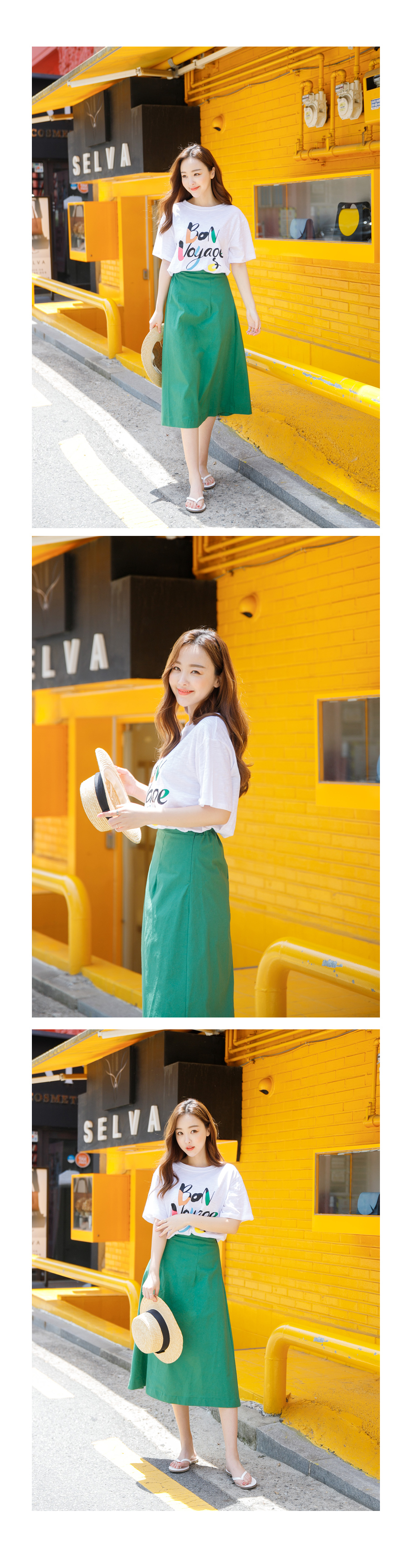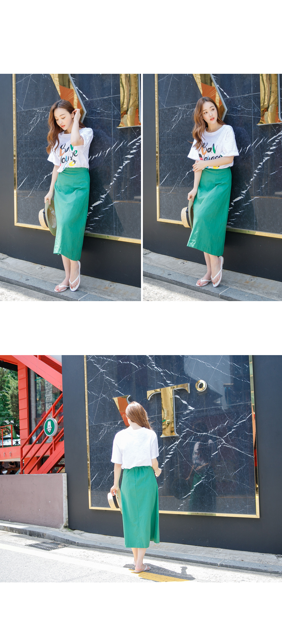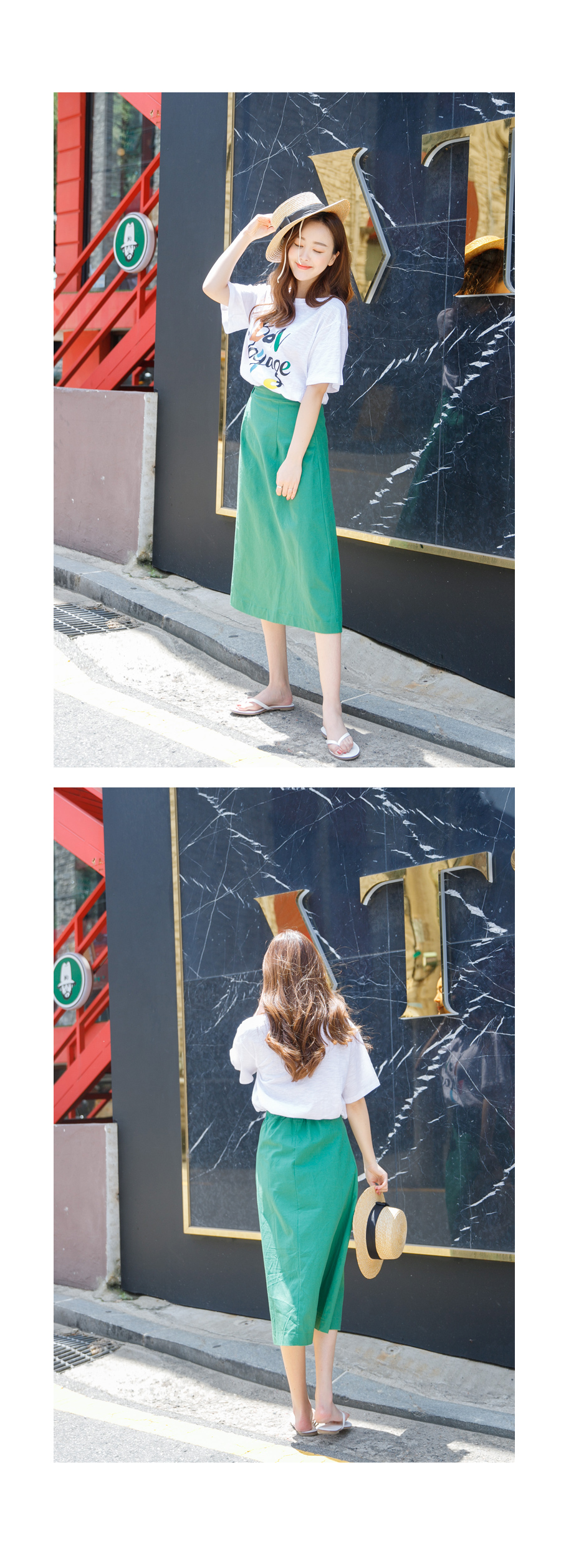 허리 오비단 아래로 세로 절개해주어 리에서 힙으로 내려오는 라인 슬림하고 예쁘게 잘 빠졌어요^^ 160cm 기준으로 7부정도 내려오는 미디 기장입니다