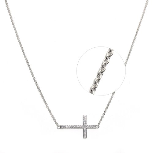 -. Title : Sterling Silver Rhodium Plated Fancy Cubic Zirconia Sideway Cross Necklace Chain 16" + 2" Extension