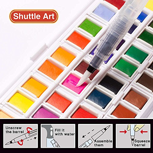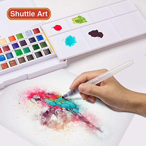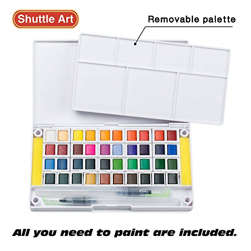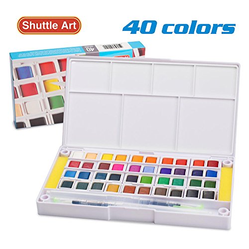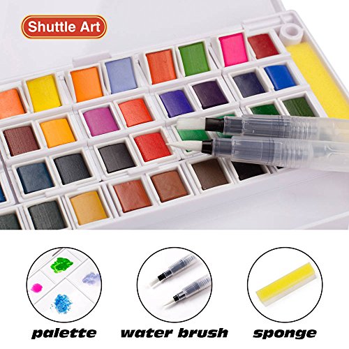 - VIBRANT FIELD SET:Shuttle Art 40 watercolor field sketch set contains 40 vibrant solid watercolor paints, 1 palette, 2 water brushes (a round tip & a flat tip) and 2 sponges.
