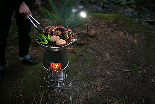 - Includes: BioLite BaseCamp stove, firestarters, fuel rack, ash tray, USB Gooseneck light, instructions