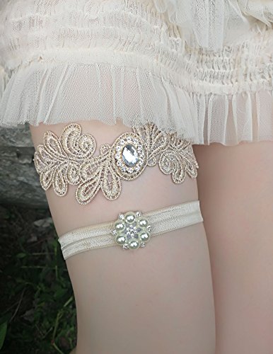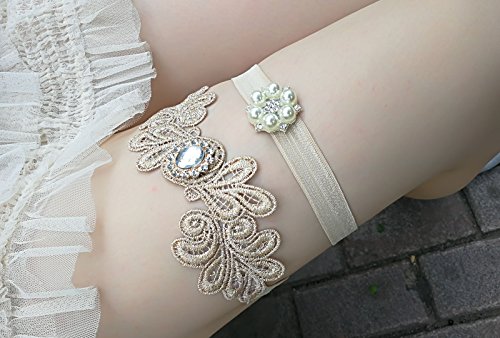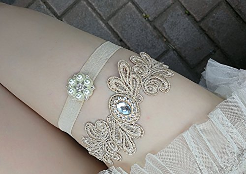 CHAMPAGNE WEDDING GARTER SET VINTAGE LACE WITH RHINESTONES