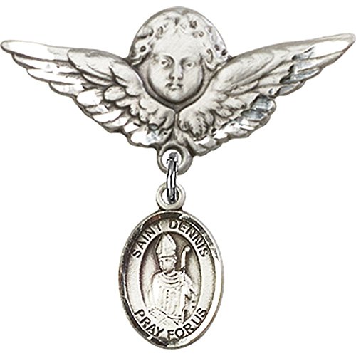 -. Title : Sterling Silver Baby Badge with St. Dennis Charm and Angel w/Wings Badge Pin 1 1/8 X 1 1/8 inches