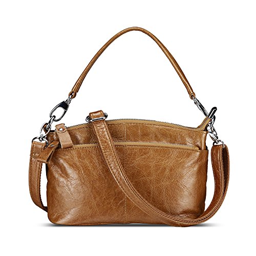 -. Feature : ✔ UPDATED Silver tone hardware, heavy duty, no rust, sturdy. / ✔ Made by genuine cowhide leather with oil wax process, smooth, soft hand feeling, premium polyester lining, very classy / ✔ [3 Large Zip Compartmens]: 2 side zip quick access pouches, 1 main interlayer compartment(1 hidden zip pouch, 2 compartment, 1 mid zip pocket, 1 side pouch), can hold smartphones, charger, small makeup necessities, wallet, tissue, perfume, chapsticks, etc / ✔ [Versatile Wearing Styles]: Package included - 1 crossbody shoulder strap(Removable & Adjustable), 1 handle strap(Removable), can be as sling bag shoulder purse, crossbody bag, handbag. / ✔ Dimensions: 9.05"(L)x 4.33"(W)x 5.51"(H), NOT for iPad or any other tablet editions.