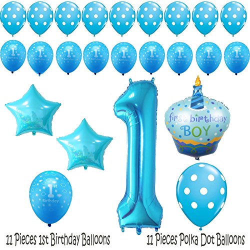 The Package Include Big Mylar Number 1 Balloon 40 Inches and One Mylar Cake Balloon 18 Inches & 2 Mylar star balloons 18 Inches.11 Latex Light Blue Polka & 1st Birthday Printed Balloons perfect decoration for your toddlers bday party.