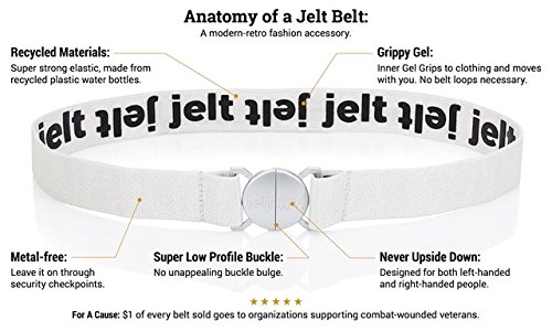 • Every Jelt belt is constructed from 100% recycled polyester elastic yarn that was made from recycled water bottles. The Jelt features a non-slip inner gel material that firmly grips to pants, keeping the belt in place without the need for any metal buckles or notches. • The Jelt is designed with a flat, metal-free interlocking plastic no-show buckle made from 100% nylon designed to avoid the unappealing look of a buckle bulge. This belt can be worn with or without belt loops. • Jelt belt width is 1.12" • This light-weight product weighs just 2oz • To clean, hand wash with water and gentle cleanser. • Jelt is proud to be certified as a Woman Owned Business on Amazon.