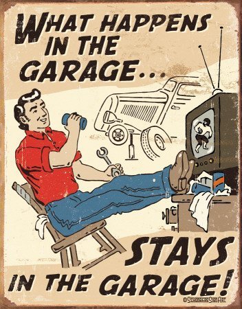 CONVERSATION PIECE: A picture speaks a thousand fold. This WHAT HAPPENS IN THE GARAGE… STAYS IN THE GARAGE tin sign will be sure to bring laughter to any conversation.