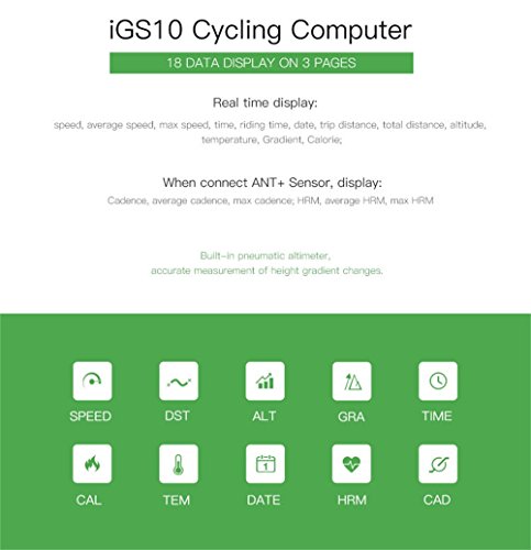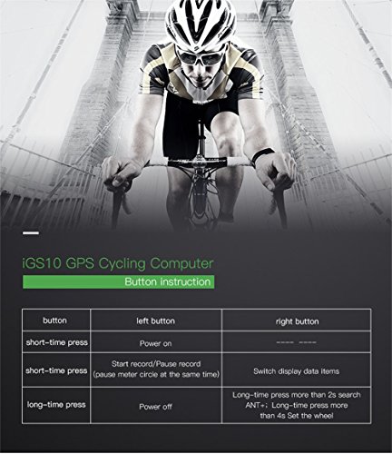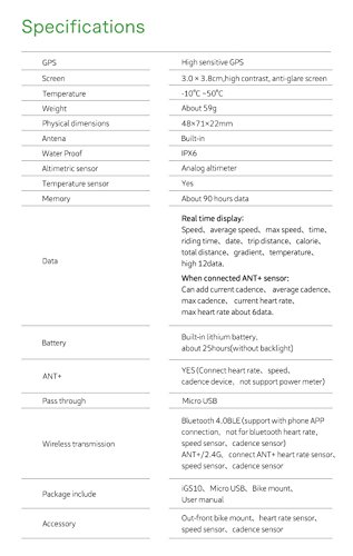 Product DescriptionSpecification: Name:iGS10 cycling computer GPS:high sensitive GPS Physical dimensions:48*71*22mm Antena:built-in Waterproof:IPX6 Memory:about 90 hours data.0