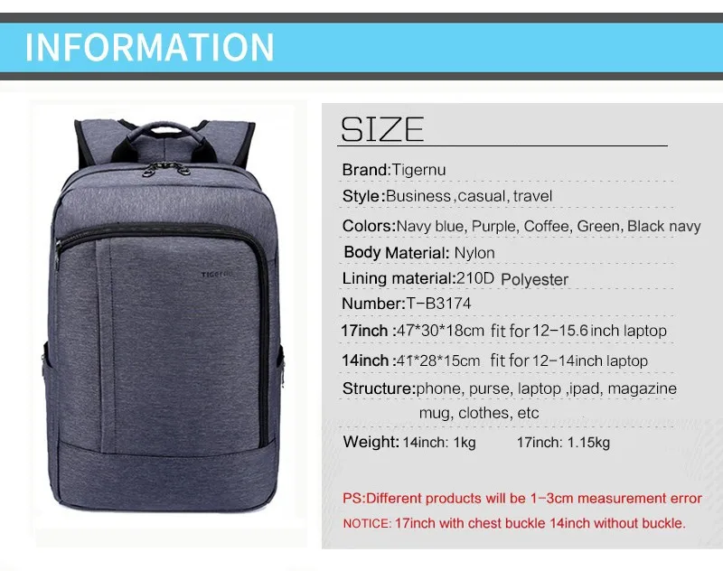 NOTICE:T-B3174 Laptop compartment size:17inch 27*39cm,14inch 24*33cm.