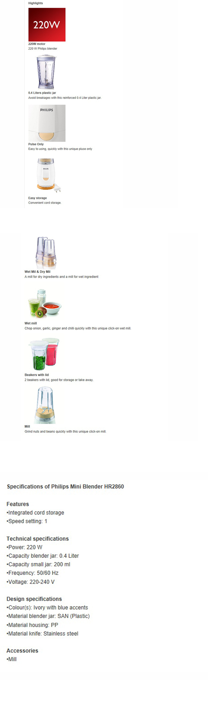 Specifications of Philips Mini Blender HR2860