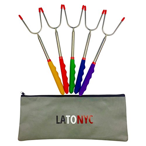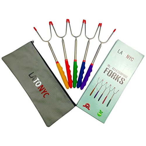 PREMIUM QUALITY MARSHMALLOW STICKS: LATONYC Marshmallow Roasting Sticks are made from Non-Toxic FDA Approved 304 Stainless Steel to ensure no rusting & safe roasting. The comfortable rubber handle with finger indents gives you a firm, steady grip. The two prongs prevent marshmallows from spinning on stick when melting.