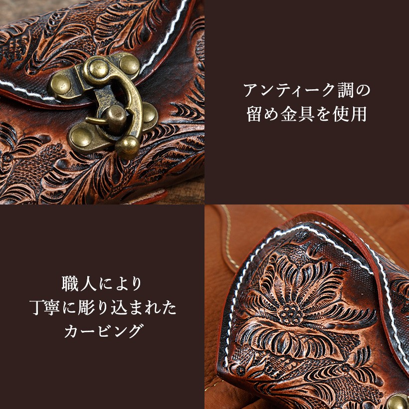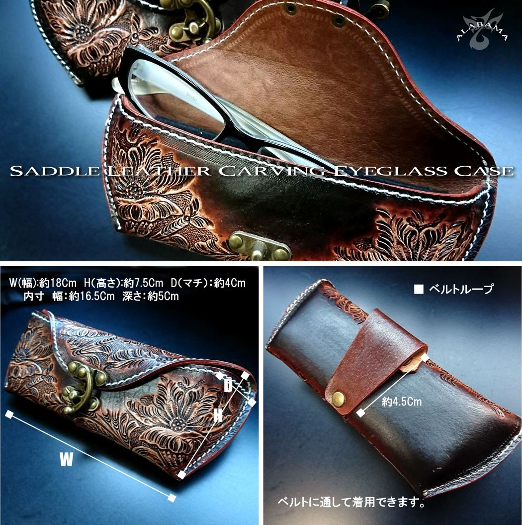 贅沢に使用したサドルレザーとアンティークパーツが絶妙。一本一本、職人の手により丁寧に彫り込まれたカービングが際立ちます。内張りはレンズに傷が付かない起毛素材を使用しています。ベルトループが付いていますのでベルトポーチとして着用できます。使い込むほどに深まるレザーの味わいが楽しめます。【素材】牛革  【サイズ】外寸:幅18cm 縦7.5cm マチ4cm 内寸:幅16.5cm 深さ5cm【カラー】ブラウン・ブラック