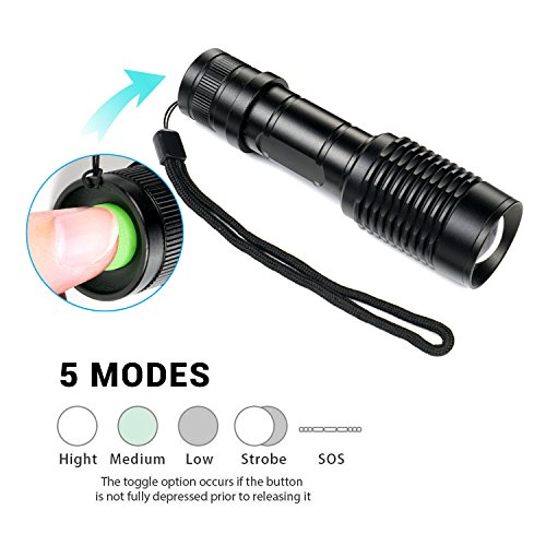 5 Lighting Mode: High/Middle/Low/strobe/SOS. Zoomable design allows you to easily switch from a narrow beam to widespread coverage