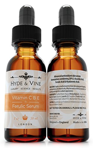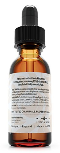 -. Binding : Misc. -. Brand : Hyde & Vine -. EAN : 0784672784818 -. Feature : ENGLISH DESIGNED LUXURY, USA SCIENCE - Hyde & Vine was born in London, England, and carries with it a story of love, beauty, entrepreneurialism and science. The brand we created represents Olde English themes; blending luxury with time-served class, alongside modern science from an FDA approved lab in the USA. The consequence of this perfect blend of luxury & science? Results! / REVOLUTIONARY ANTI AGING SUPER SERUM - Fight back against aging with a powerful & professional formulation designed to boost collagen production, lighten and tighten the skin and reduce free radicals, thereby improving the appearance of fine lines and wrinkles, whilst also improving skin's firmness and hydration levels, and reducing damage caused by oxidative stress. / HIGH POTENCY ANTIOXIDANT - Hyde & Vine brings you Vitamin C, B, E & Ferulic Serum with Hyaluronic Acid, where actives work synergistically to boost one another to produce a high potency antioxidant & anti-aging skin care serum which gets results. With our serum, the whole really is greater than the sum of it's parts! With all these ingredients working together, this vitamin-loaded formula delivers the full scope of antioxidant care, and complete skin rejuvenation, moisturizing and lightening treatment. / REDUCE APPEARANCE OF FINE LINES AND WRINKLES - Vitamin C plays a significant role in the Collagen synthesis process, which helps to plump aging skin, whilst reducing the appearance of fine lines and wrinkles. Vitamin E, like C, is a powerful antioxidant which protects the skin from scarring and age spots, plus helps to improve the skin's hydration levels. Together these 2 minerals regenerate each other, optimizing each other's antioxidant effects. / LIFETIME GUARANTEE - We are so confident in the science behind our product that we are offering a 100% lifetime guarantee, meaning you can try it with total confidence. -. Label : Hyde & Vine -. Manufacturer : Hyde & Vine -. ProductGroup : Beauty -. ProductTypeName : BEAUTY -. Publisher : Hyde & Vine -. Size : 1fl oz -. Studio : Hyde & Vine -. Title : Hyde & Vine - Vitamin C Serum 20% + Vitamins B & E + Ferulic & Hyaluronic Acid - Advanced Professional Anti-Oxidant Skin Care Serum Providing the Best & Most Powerful Anti-Aging Treatment for Your Eyes & Face - Reduces Fine Lines & Wrinkles - Fights Free Radicals - Brightens and Evens Skin Tone - Leaving You Feeling More Youthful with Younger and Firmer Looking Skin - Guaranteed Results - 100% Lifetime Money Back Guarantee -. UPC : 784672784818