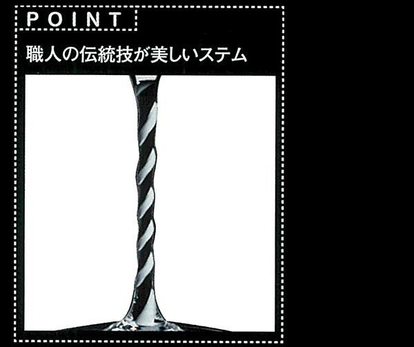 | ヴェネチアンガラスの伝統技法を用いたツイストステムのグラス。イタリア語で「手作り」を意味する(ファット・ア・マーノ)は、これまでのリーデルグラスとは異なる新しいプロセスで作られています。ヴェネチアンガラスの技法で「手作り」された白と黒のツイストステムに、機械による吹きガラスのボウルを結合することで、「職人の手で作られたステムの感触、ワインの個性を引き出すボウル」が誕生しました。 |