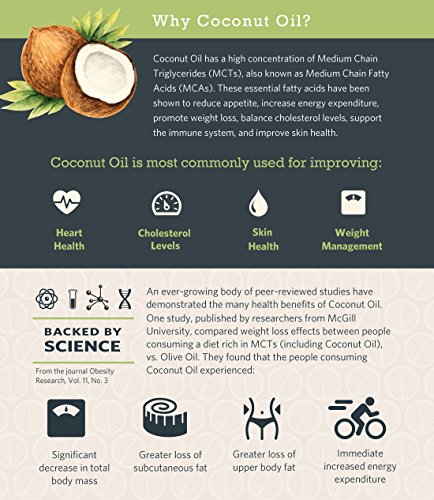 COCONUT OIL HEALTH BENEFITS: The organic, cold pressed, extra virgin coconut oil that we use to make our coconut oil supplement provides a wide variety of health benefits. The medium chain triglycerides (MCTs) found in coconut oil are broken down quickly by the human body and converted into energy, making you feel energized. It is also a natural appetite suppressant; keytones formed by MCTs are known to reduce hunger, and using coconut oil on a daily basis can help you feel full faster.