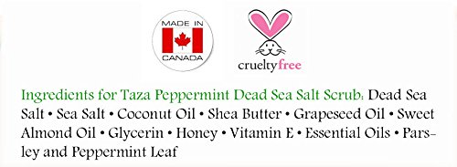 Key ingredients: Dead Sea Salt, Coconut Oil, Shea Butter, Grape Seed Oil, Sweet Almond Oil, Glycerin, Vitamin E, essential oils, and Peppermint Leaf. Suitable for all skin types. Get your Taza Peppermint Dead Sea Salt Scrub.