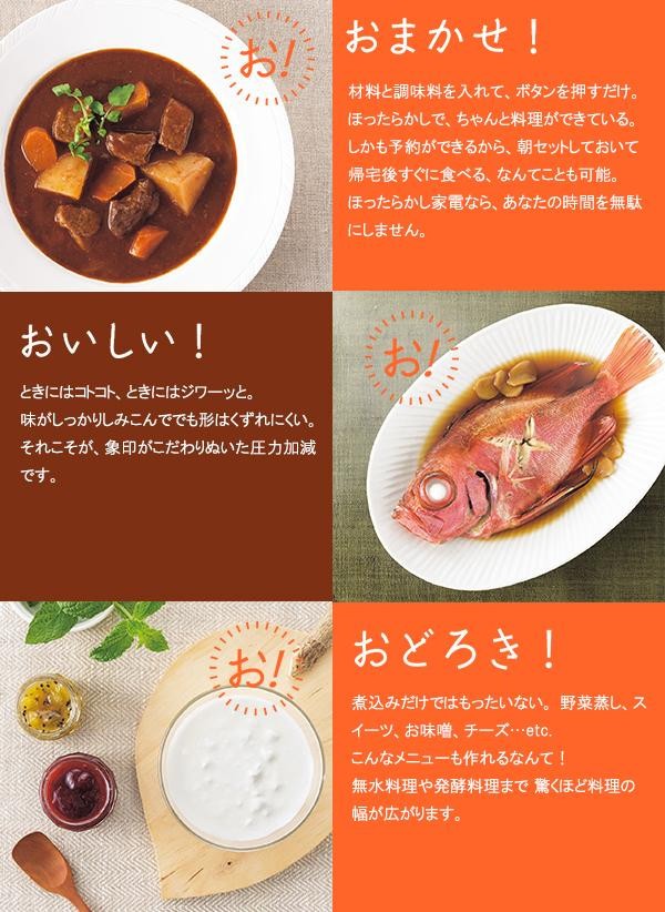 | 材料を入れるだけで簡単に調理ができる自動調理機能付きの圧力IHなべです。「予約調理」、「保温」もできるからとっても便利♪素材の栄養を丸ごと食べられる「無水料理」も可能です。付属のレシピブックには150以上のレシピを掲載♪ |