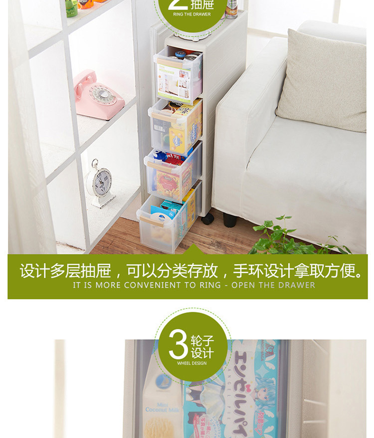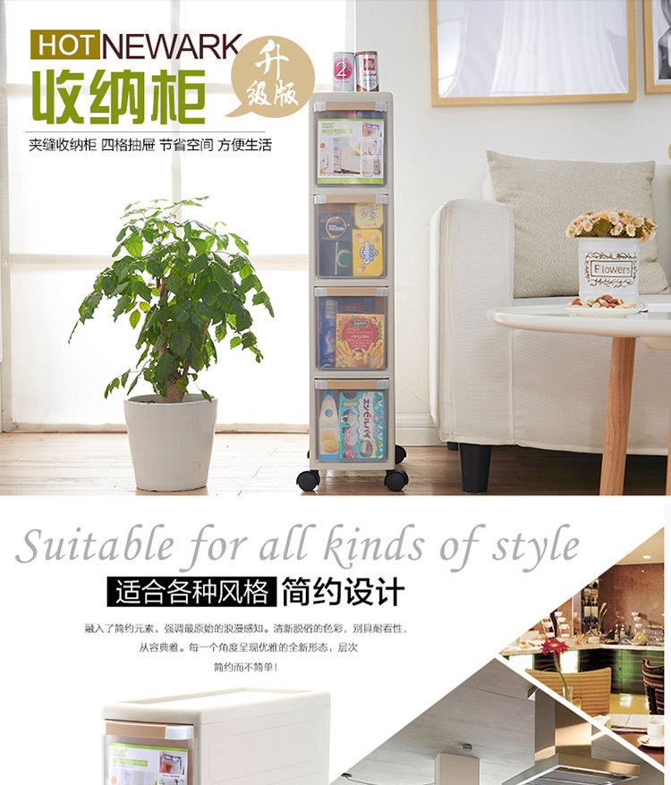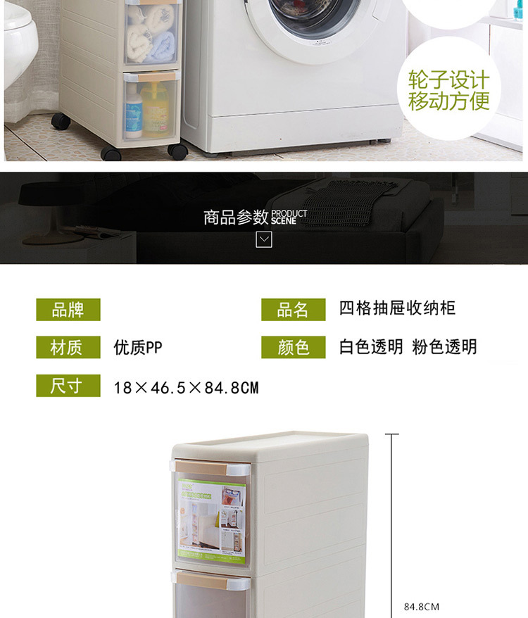 新款四层夹缝抽屉柜,充分利用家居的缝隙空间,用来收纳各种杂物、调料、瓶瓶罐罐等,优质PP材料生产,透明抽屉一目了然,滑轮设计方便移动,厨房,卫浴,客厅,卧室均可使用!