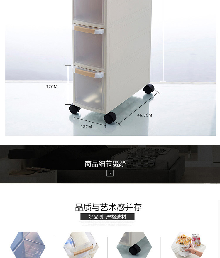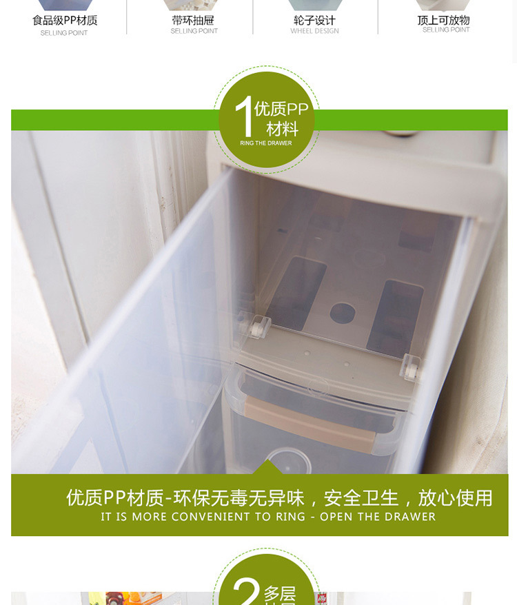 新款多层组合抽屉柜,充分利用家居的缝隙空间,用来收纳各种杂物、调料、瓶瓶罐罐等,优质PP材料生产,滑轮设计方便移动,厨房,卫浴,客厅,卧室均可使用!