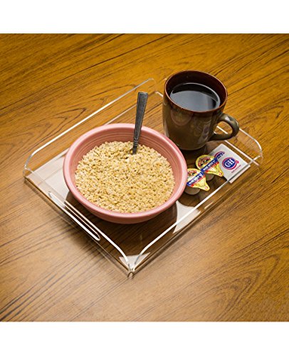 - MULTIPURPOSE. This clear acrylic serving tray is great for everyday use. Grabbing both handles from the side makes serving cocktails, appetizers and breakfast very easy and enjoyable. The clear acrylic compliments the sleek modern design making this serving tray both simple and elegant for celebrations and dinner parties