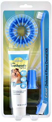 Dental kit includes: Canine toothpaste (3.25 oz.); Dual-headed pet toothbrush; Soft pet finger toothbrush; A dental chew toy ring