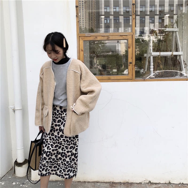 秋冬撞色包边口袋开衫仿羊羔毛外套