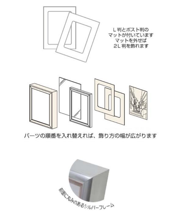| 仕様 | 縦横兼用(スタンド付) 置きのみ対応 マット2枚付(L判窓寸:89×120mm、ポスト判窓寸:96×142mm) 対応写真サイズ:L判、ポスト判、2L判 外枠:シルバーフレーム |