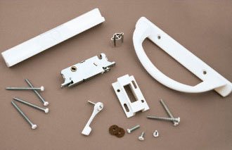 -. Feature : Complete Patio Door Handle Kit / Vinyl Universal Sliding Glass Door Handle Kit / Lever Latch-High Security Design / Used with many latch assemblies - Keeper and Spacer / Replaces wood pull handles on sliding doors