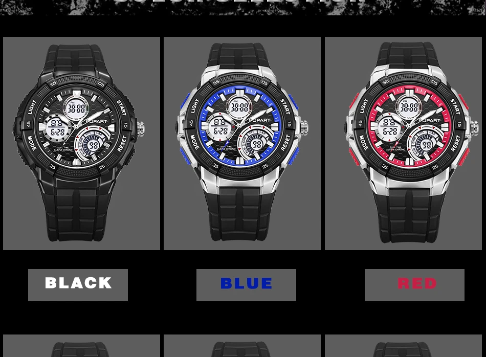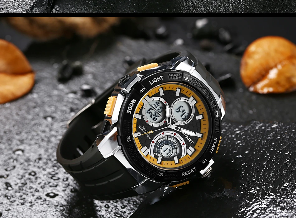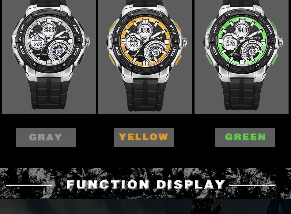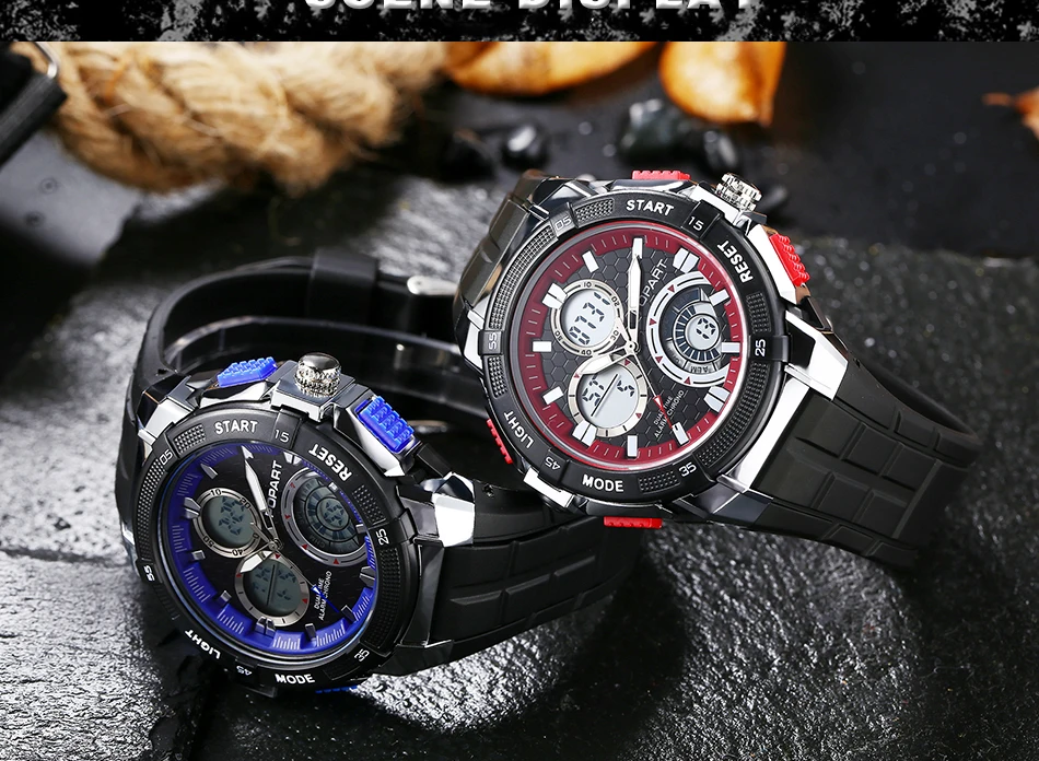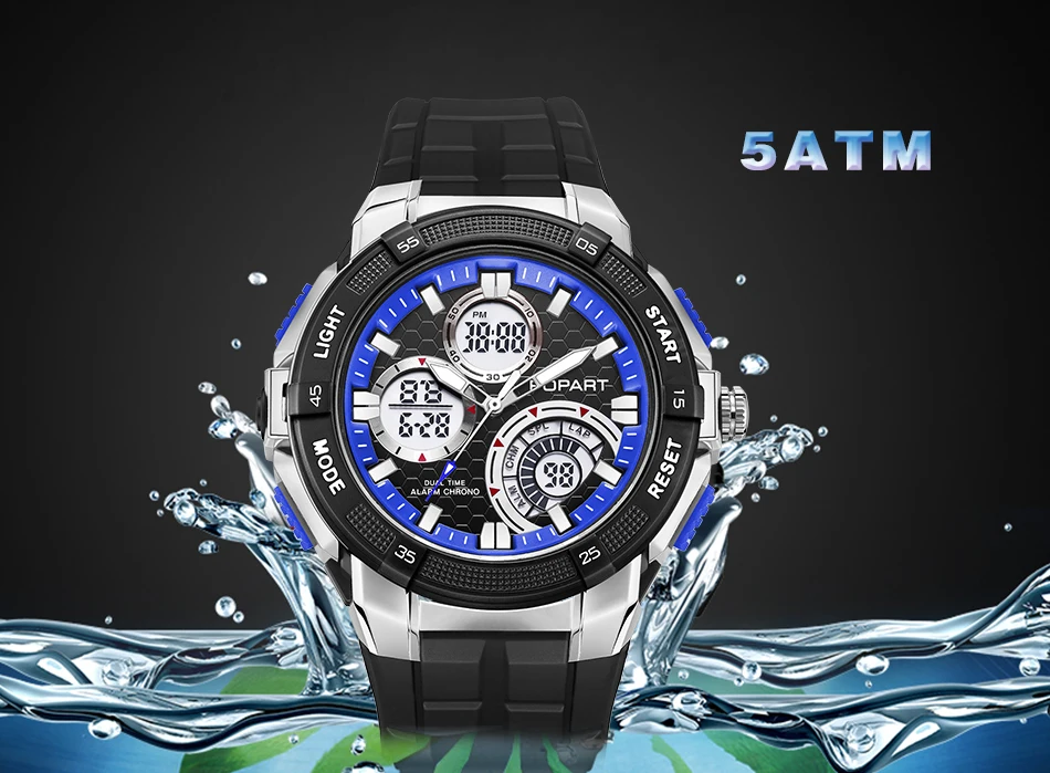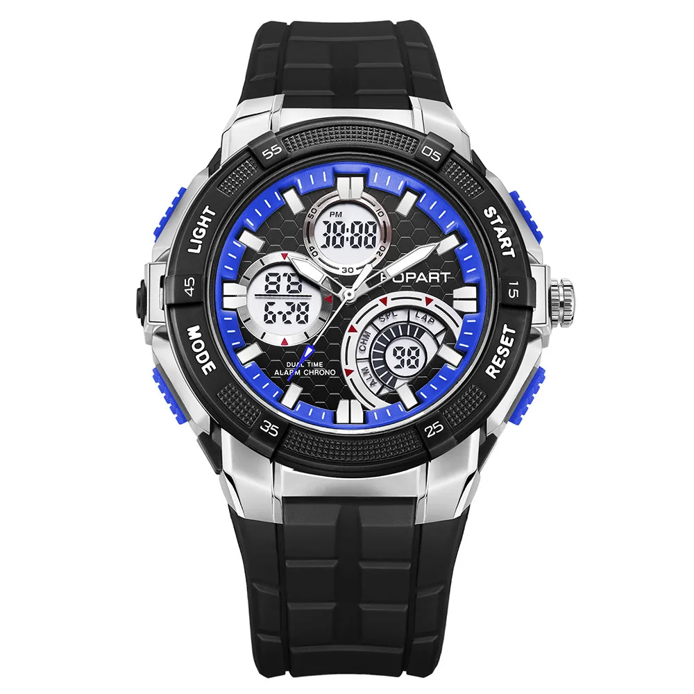Feature:Water Resistant,LED display,Multiple Time Zone,Stop Watch,Back Light,Shock Resistant,Chronograph,Auto Date,Week Display,Alarm