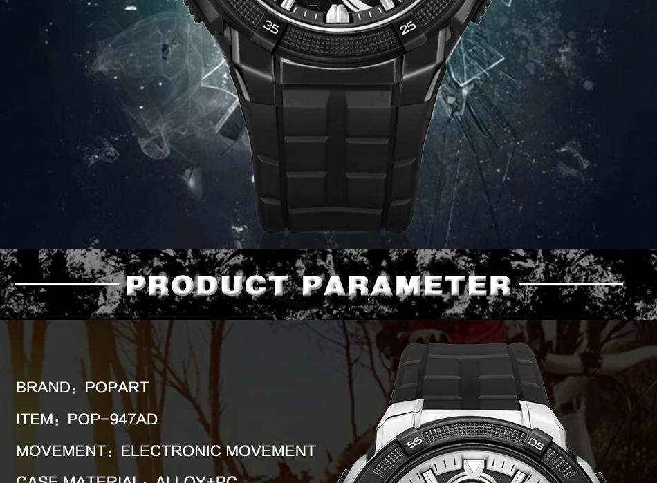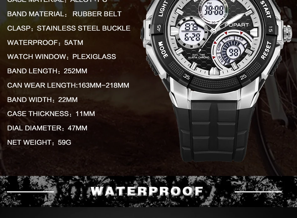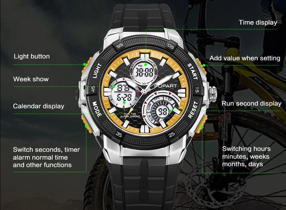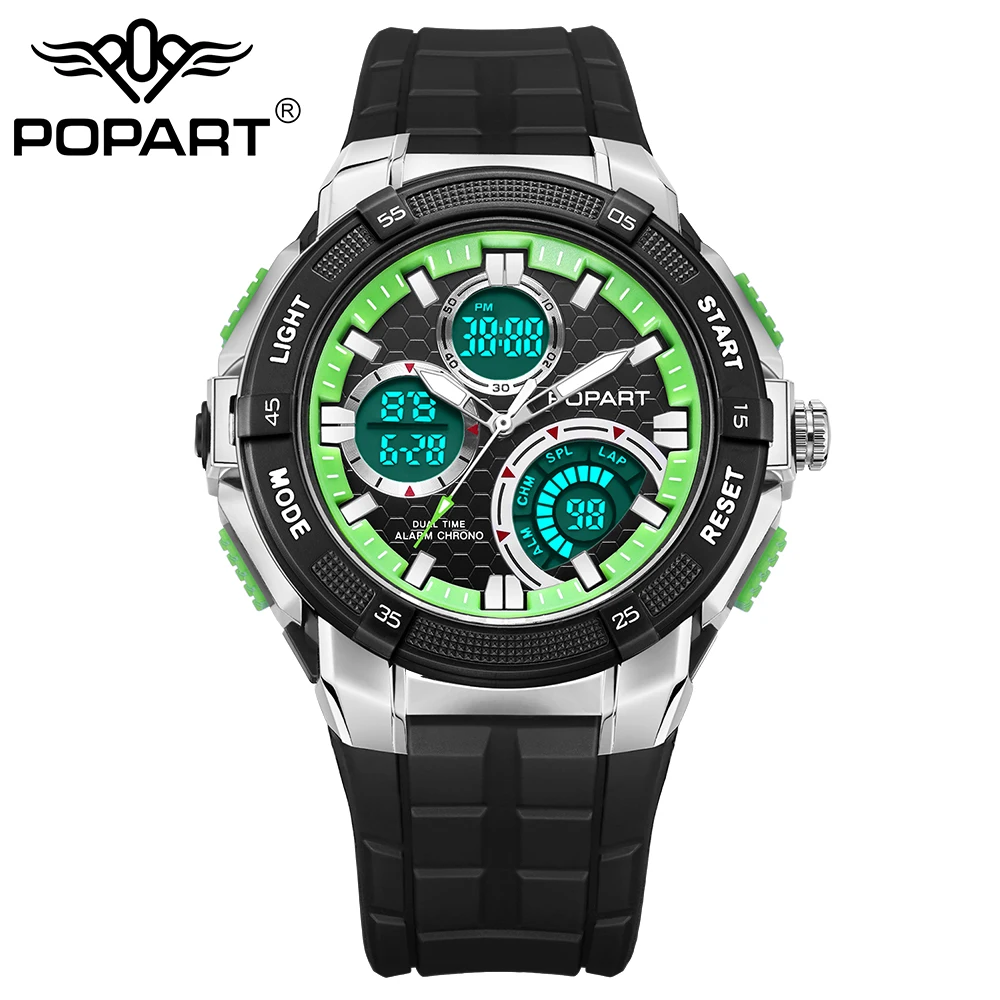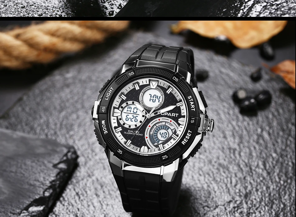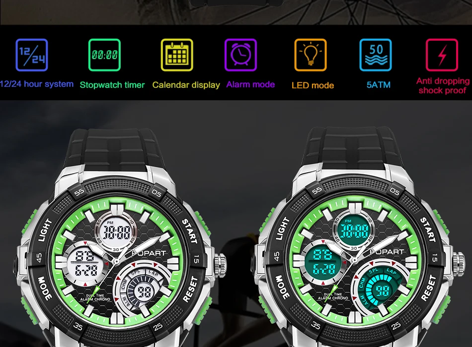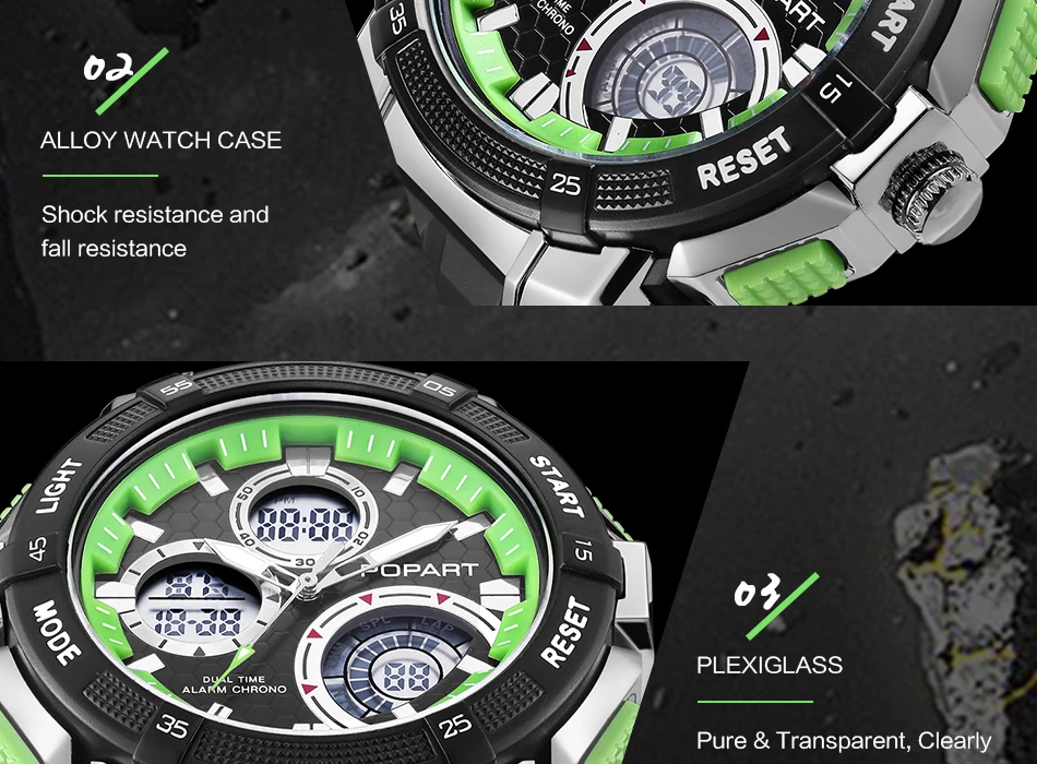 Feature:Water Resistant,LED display,Multiple Time Zone,Stop Watch,Back Light,Shock Resistant,Chronograph,Auto Date,Week Display,Alarm