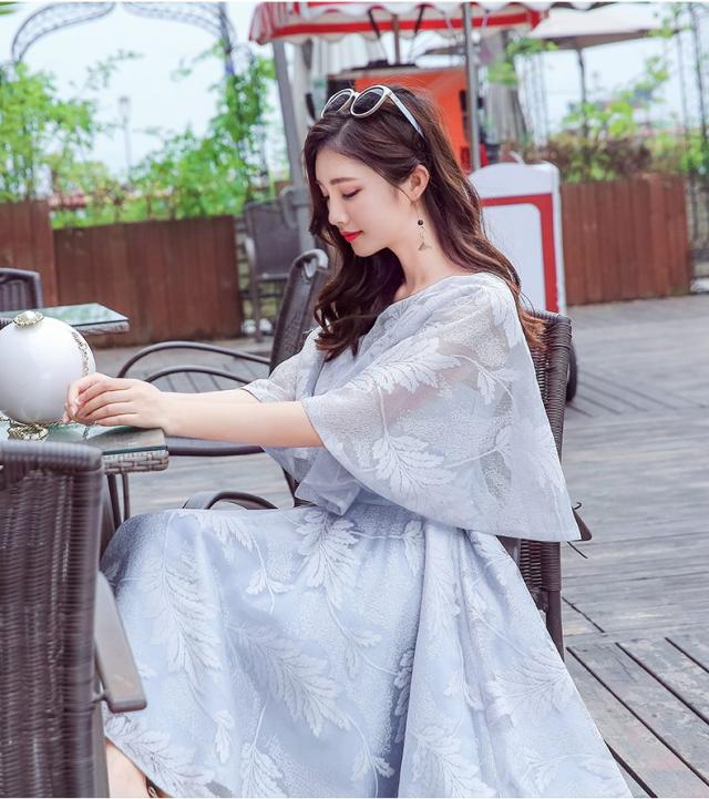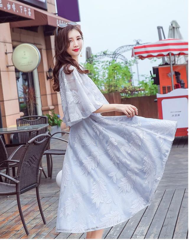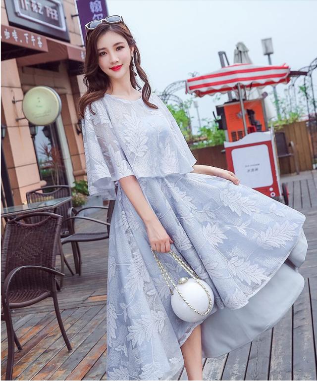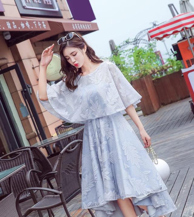 ケープ風とレースの仕上げのフレアシルエットワンピース。