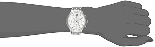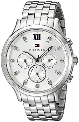 Stainless steel case with a stainless steel bracelet. Fixed stainless steel bezel. Silver dial with luminous silver-tone hands and crystal hour markers. A Roman numeral appears at the 12 o'clock positions. Minute markers around the outer rim. Dial Type: Analog. Luminescent hands and markers. Date display at the 3 o'clock position. Three multi-function sub-dials displaying: date, day of the week, and 24 hours. Quartz movement. Scratch resistant mineral crystal. Pull / push crown. Solid case back. Case diameter: 39 mm. Case thickness: 8 mm. Round case shape. Band width: 18 mm. Fold over clasp with safety release. Water resistant at 30 meters / 100 feet. Functions: date, day, hour, minute, second. Dress watch style. Tommy Hilfiger Amelia Silver Dial Stainless Steel Ladies Quartz Watch 1781610.Feature