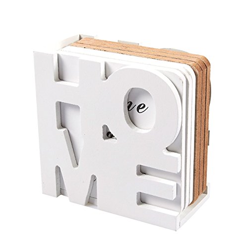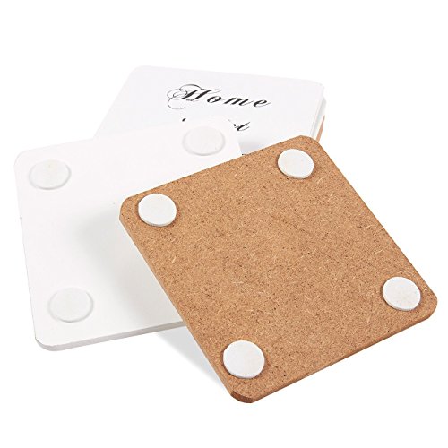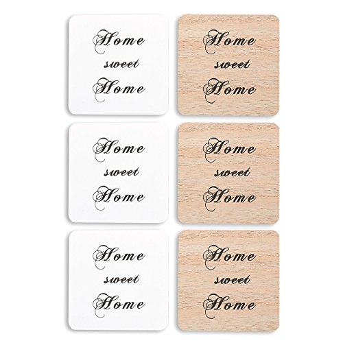 -. Feature : WOODEN COASTERS: Each package comes with 6 square wooden coasters and a coaster holder. There are 3 white coasters and 3 brown coasters with the words "Home Sweet Home" printed on the surface. On the back of each coaster are 4 round bumper paddings to prevent them from slipping and scratching the table or bar surface. / SIMPLE AND CHIC: The coasters are printed with the words "Home Sweet Home" in a Renaissance cursive font, giving it an old-fashioned look and feel. The standing coaster holder is modeled as the word 'Home', making this the ideal housewarming gift for your friends and loved ones. / PROTECTS TABLE SURFACE: These coasters will act as a barrier between your hot drinks and wooden table or counter top, preventing white water stains and heat burns. / EASY MAINTENANCE: Clean the coasters by wiping them with down with a piece of dry or damp cloth after use and return them to the coaster holder, making storage quick and easy. / DIMENSIONS: The square coasters are 3.9 x 0.19 x 3.9 Inches. Coaster holder is 4.1 x 4.1 x 2.1 inches.