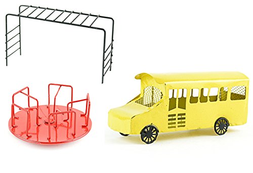 Miniature Garden Yellow School Bus and Playground Equipment Set includes Bus, Monkey Bars and Red Merry-Go-Round