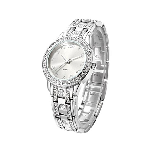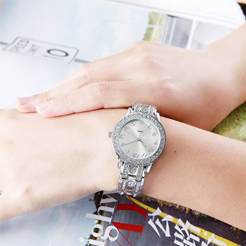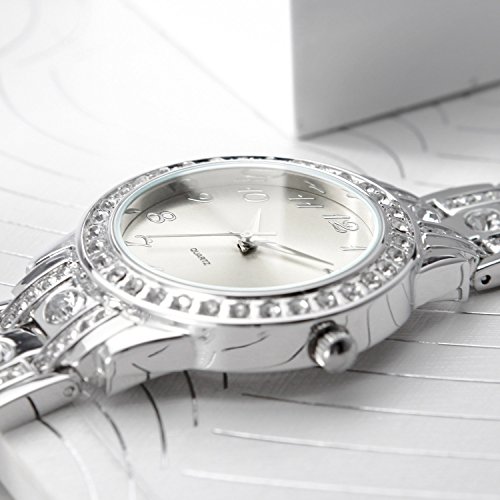 Silver tone crystal-embellished bezel with mineral glass, 12 big Arabic numerals easy to read watch case