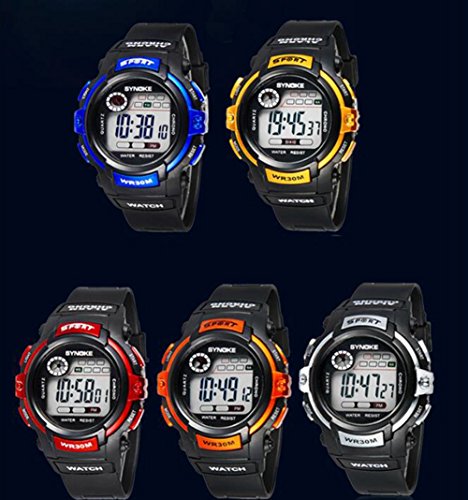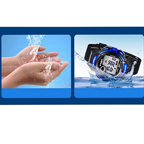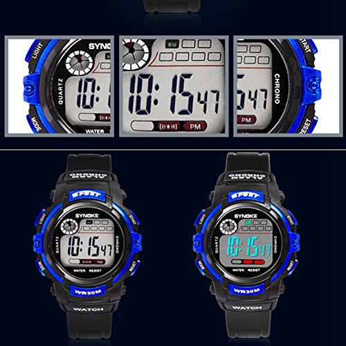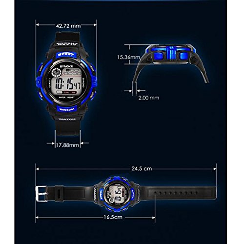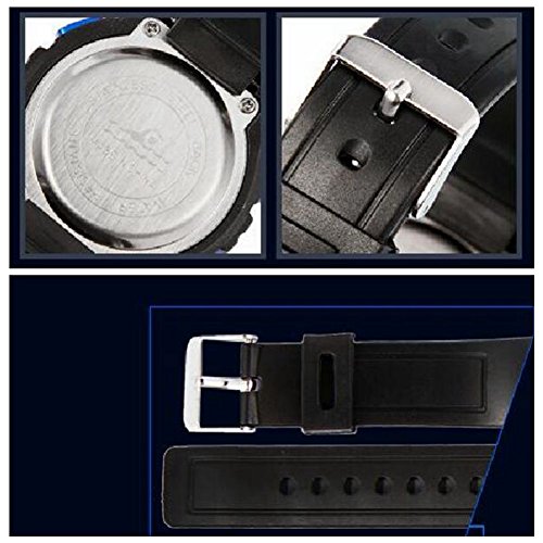 -. Feature : Multifunction: Backlight, alarm, stopwatch, week and digital time display. / High quality environmentnal friendly PU material band with ABS material case and durable acrylic mirror surface, sturdy in structure. / Backlight function to show time clearly at night. / Daily water resistance depth to 3ATM, convenient for your daily life. / Excellent sports watches for kids and friends.