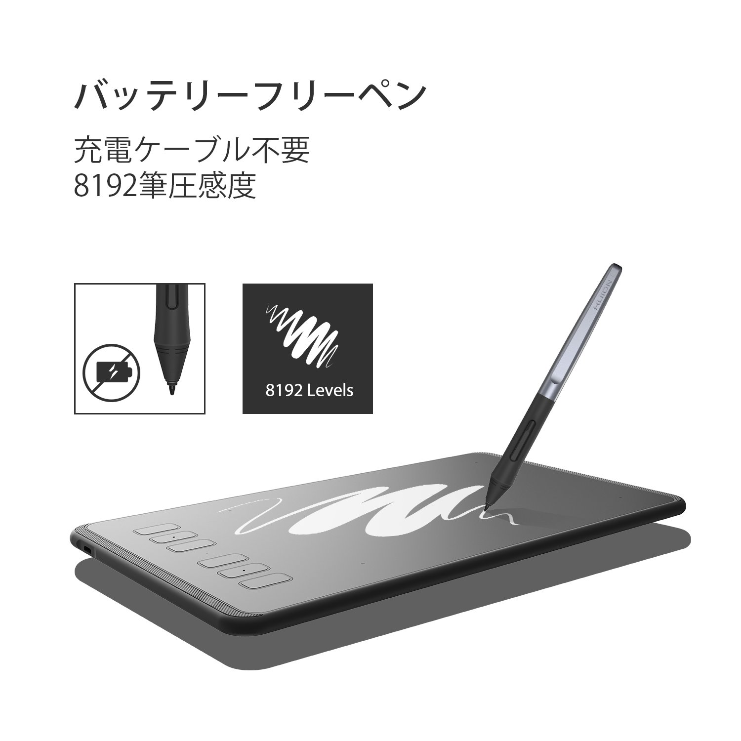 As the pen tablet of HUION, we adopted the electromagnetic induction method which does not need the first battery, no charge, and we have a pen with built-in smart chip.