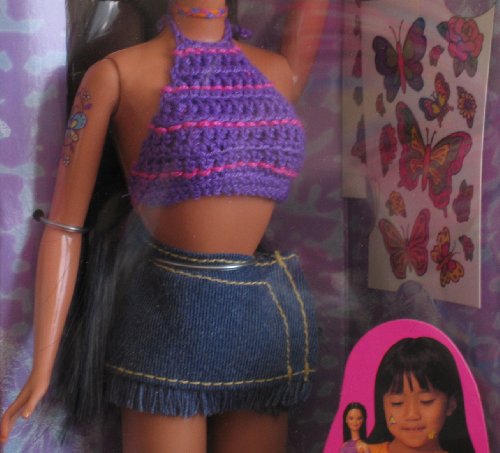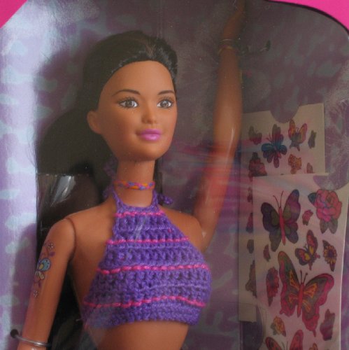 - Doll wears 2 Piece Swim Suit (Halter style Top and Bikini Bottom), a blue mini denim Skirt w/fringe at hem. Comes w/purple Hairbrush, and 2 Sheets of cool Temporary Tattoo Decorations for Kira and YOU to wear.
