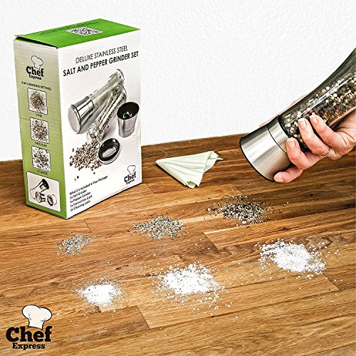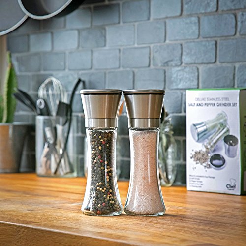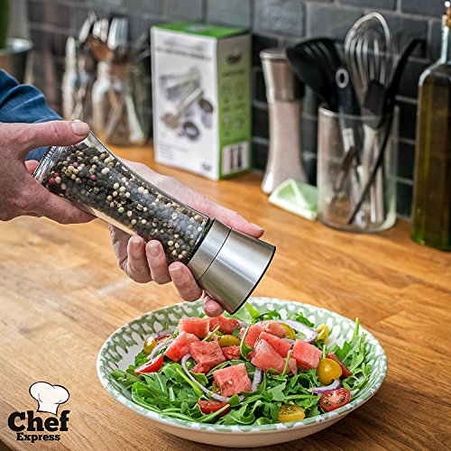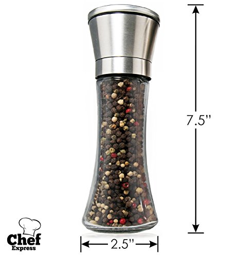 Best Deluxe Salt and Pepper Grinder Set of 2 - Professional Salt and Pepper Shakers - Pepper Mill and Salt Mill - 6 Oz Glass Tall Body and Adjustable Ceramic Rotor - By Chef Express Products