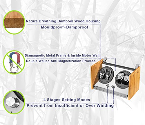 -. Feature : 🕓 【SINCE 2007,100% CRAFTSMANSHIP】: Patent watch winder box with special noble look bamboo wood housing case, practical and ornamental for couple size watch X4 / 🕓 【PREVENT FROM INSUFFICIENT OR OVER WINDING】:The quad watch winder with 4 stage setting modes control knob each holder for different usage habits winding needed / 🕓 【DOUBLE WALLED ANTI MAGNETIZATION PROCESS】: Both real brushed metal frame & inside motor wall are made from diamagnetic material, better protecting your or other watches from magnetizing / 🕓 【SLEEPING NOISE STANDARD SUPER QUIET JAPANESE MOTOR】: 10~20 DB = sound of breeze when operating, watch winder box can be positioned in bedroom / 🕓 【2 YEAR WARRANTY, MOULDPROOF + DAMPPROOF】: 100% Natural bamboo wood housing + metal frame, makes the watch winder case MOULDPROOF + DAMPPROOF VS to those from MDF panel and PU liner
