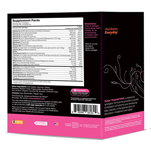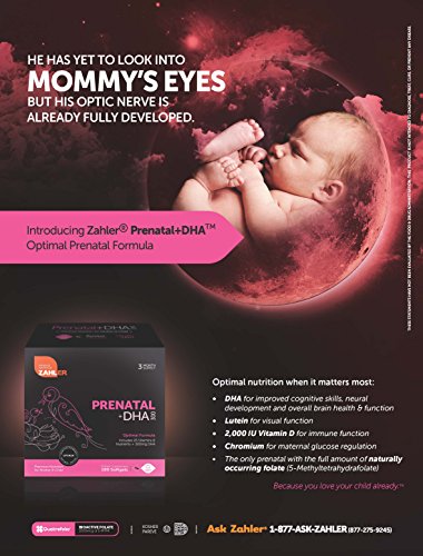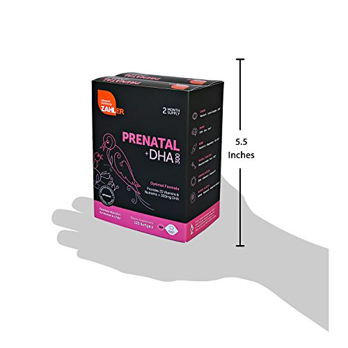 Zahler's Prenatal DHA is a balanced synergistic formula that provides a curated compilation of nutrients your developing baby requires in optimal ratios for absorption, metabolism and safety. Zahler Prenatal DHA is a complete prenatal multivitamin supplement which includes 25 vitamins and nutrients plus 300mg of DHA. Prenatal with DHA provides premium nutrition for mother and child with optimal ratios.Prenatal DHA contains optimal ingredients including 300mg of DHA which aid in vision, bone function,neural tube, immune system and mental health. Zahler's prenatal is made in the USA in a state of art GMP certified facility.WARNING: Please be advised that this prenatal should not be taken without consulting your doctor since each individual responds differently to each supplement. In addition if after taking this supplement you experience extreme nausea, dizziness or other unusual symptoms please stop taking it as once and consult with your doctor straight away.Feature