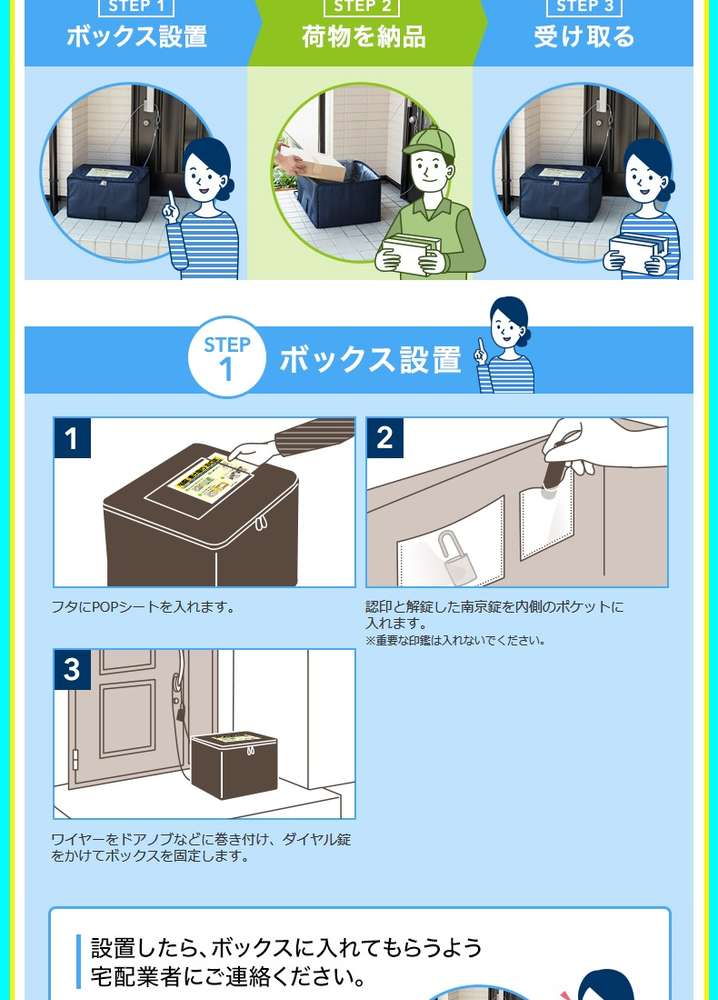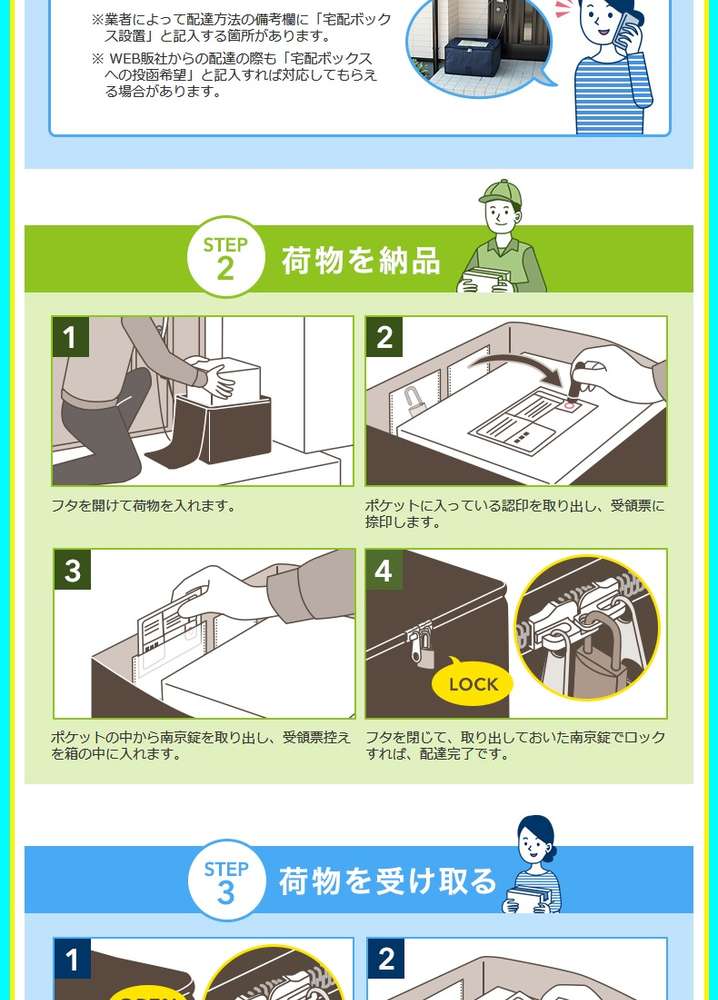 ●宅配業者や郵便局が、受け取り人留守の場合に荷物を預け入れられるボックスで、荷物の受け渡しができる簡易的な設備です。