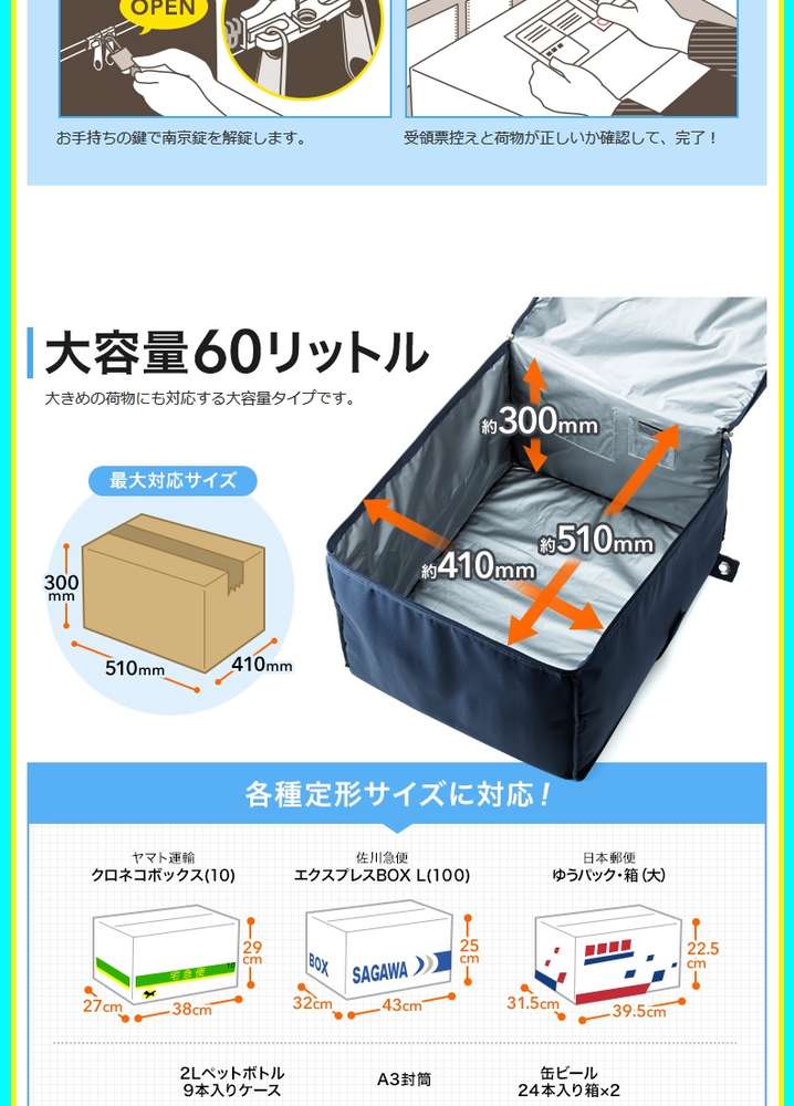 ●ご自宅の玄関前に簡単に設置できて、留守中にも預け入れ可能な大容量の60Lボックス。