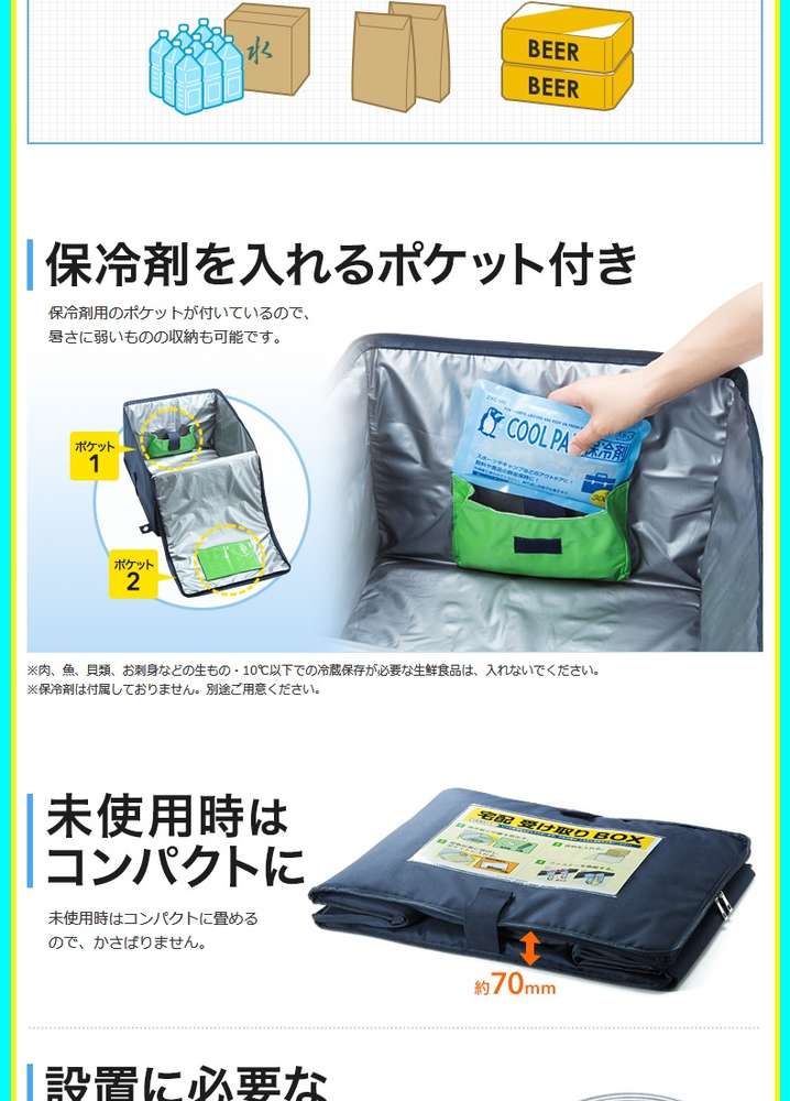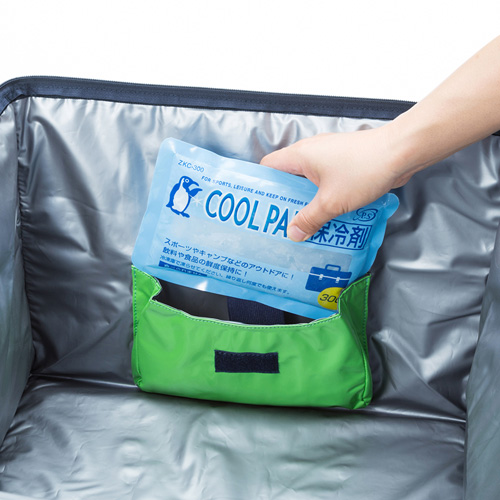 ●本体:ロックファスナー、保冷材用ポケット、印鑑用PVCポケット、説明POP用PVCポケット、折り畳み用マジックテープ、ワイヤー通しタグ、